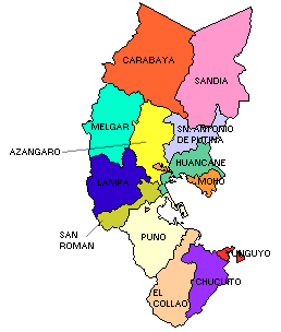 Mapa Provincia de Puno Mapa Provincia del Collao Mapa Provincia de Yunguyo Mapa Provincia de Chucuito Mapa Provincia de San Roman Mapa Provincia Huancané Mapa Provincia Moho Chucuito: la gran capital del estado LupaqaLa ciudad de Chucuito, a 15 kilometros al sur de Puno-ciudad, es la antigua urbe-capital del estado Lupaqa (Lupi=sol, Jaqi=gente), cuando el pueblo aymara era próspero, y políticamente independiente, con sus diferentes estados soberanos. Posiblemente, hasta el surgimiento de Potosí, Chucuito haya sido la urbe mas importante al sur de Cusco. Además de Chucuito el estado Lupaqa poseía otras seis ciudades cabeceras; Axura(Ácora), Jilawi(Ilave), Xuli(Juli), Puma Uta(Pomata), Sipit'a(Zepita) y Yunka Uyu(Yunguyo), todas en el lado sur del Lago Titicaca. Los límites de este estado eran; por el norte el estado, también aymarista, Qulla cuya capital es Atuncolla (Hatun Qulla), por el sur limitaba el estado Pakaxe (Paka=gavilán, jaqi=gente), otro gran estado aymara, siendo la divisoria común el rio, actualmente denominado, Desaguadero. Se especula que por el lado occidental el límite Lupaqa haya sido el propio mar Pacífico pues los poblados de Sama y Moquegua(Mukhiwa=huele) eran considerados territorios de Chucuito hasta el siglo XVII. Existen citaciones de que las regiones de Tarata, Tacna y Arica estaban bajo la hegemonía de Chucuito. Es también un hecho fehaciente la extensión territorial Lupaqa al lado oriental del lago Titikaka, en la provincia de Larecaxa(actual Bolivia). El prestigio de Chucuito era tan grande que, posiblemente, el nombre primigéneo del lago Titicaca es lago Chucuito, como hasta ahora se contínua denominando al lago mayor.Los españoles llamaron todo el territorio Lupaqa de Provincia de Chucuito, (ó Chiquitos), conforme puede atestar el informe "Visita hecha a la Provincia de Chucuito" de Garcí Diez de San Miguel publicado en 1567, fuente invalorable de la estructura socio-politica de los aymaras lupaqas, pese a estar bajo el domínio Inca. Gracias, también, a este prestigio de Chucuito, un distrito del lejano Callao, en Lima, se llama Chucuito. En Arica, hasta antes de la derrota peruana de la guerra del Pacífico, el actual pasaje Sangra (para los peruanos Sangará), se llamaba pasaje Chucuito, conforme varios documentos municipales ariqueños.