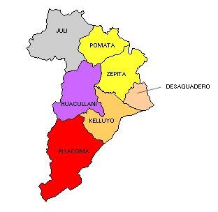 Después de la conquista española la ciudad de Chucuito extendió su nombre a todo el territorio de los Lupakas, e incluso según primeros documentos españoles al lago Titicaca. El otro centro urbano importante del señorio Lupaka fué Juli. Durante la colonia la ciudad de Chucuito fué, junto a Oruro, Carangas y La Paz, una de las sedes de la cajas reales(tesorería) españolas de la región. Por otro lado Juli fué un centro misionero pionero de los jesuitas que llegó a tener una de las primeras imprentas de la región. Fue en estas circunstancias que Ludovico Bertonio publicó, en Juli, su Vocabulario de la Lengua Aymara en el año de 1612. Desde los primordios de la era republicana la ciudad de Chucuito, la antigua capital del reyno Lupaka ha sido incorporado a la Provincia de Puno mientras que Juli es la capital de la provincia de Chucuito. Provincia de Puno Antes de la conquista española este territorio era totalmente aymarista, siendo la parte sur integrante del territorio Lupaqa y la parte norte del territorio de los Qollas. la ciudad de Atuncolla (Hatun Qolla) fué la capital del reyno Qolla. Algunos historiadores indican que también fué la capital de una probable alianza Lupaqa-Qolla. En ese lugar a orillas de la laguna de Umayo están las ruinas de las chullpas Sillustani, máximo exponente de la antigua arquitectura de los Qullas. En el distrito de Pichacani están las chullpas de Cutimbo (Kutimpu) que son otro vestigio notable de la antigua civilización aymara. En Acora están las ruinas de Mulluq'u Provincia del Collao Hasta 1980 hizo parte de la provincia de Chucuito. Sus pampas de Chipana y Pilcuyo por su inmensa fertilidad seguramente fueron el principal lugar de abastos alimentarios de los Lupaqas Provincia de Yunguyo (Yunka Uyu=Enclave de los Yungas) Esta provincia también es un ex-distrito de la provincia de Chucuito. Lupaqa Provincia de San Roman Ahora en esta provincia existen pocos aymaristas. Antiguamente perteneció al reyno aymara de los Collas. El nombre de su ciudad capital Juliaca es un derivado de la palabra aymara Kullaka(=hermana). |