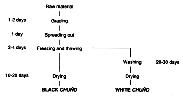 If bitter potatoes are to be eaten, they must first undergo processing to remove the glycoalkaloids. Traditional processes in the upper Andean area. described in various works, consist of exposing the tubers to several night frosts and drying them in strong sunlight at altitudes of 4 000 m to obtain black chuño. Larger bitter potatoes are preferably used to prepare white chuño, also called tunta (Aymara) or moraya (Quechua). Freezing is followed by the peeling, hydrating for up to 30 days and drying.