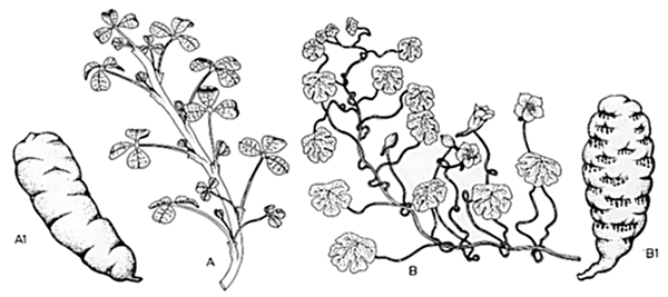 Figure 15. Andean tubers: A) oca (Oxalis tuberosa); A1) tuber; B) mashwa (Tropaeolum tuberosum); B1) tuber