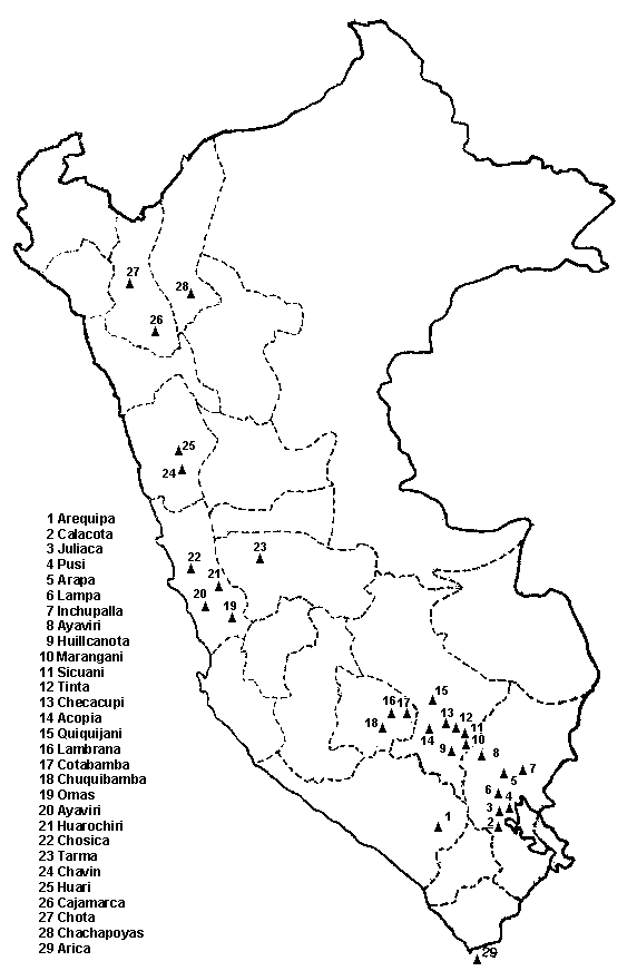 Me sorprendió encontrar una referencia en Middendorf sobre la presencia de topónimos con elementos Aymaras muy al norte de Perú. Lamentablemente la historia antigua de los Aymaras nos es desconocida en gran parte por lo que es dificil conocer de qué época datan esos topónimos y a qué cultura estuvieron asociados (presumiblemente la cultura Nazca 200 d.C. y la cultura Huari posterior pueden ser atribuidas verosímilmente a hablantes de proto-aru u otras lenguas aymaroides). La lista que presenta Middendorf es la siguiente: